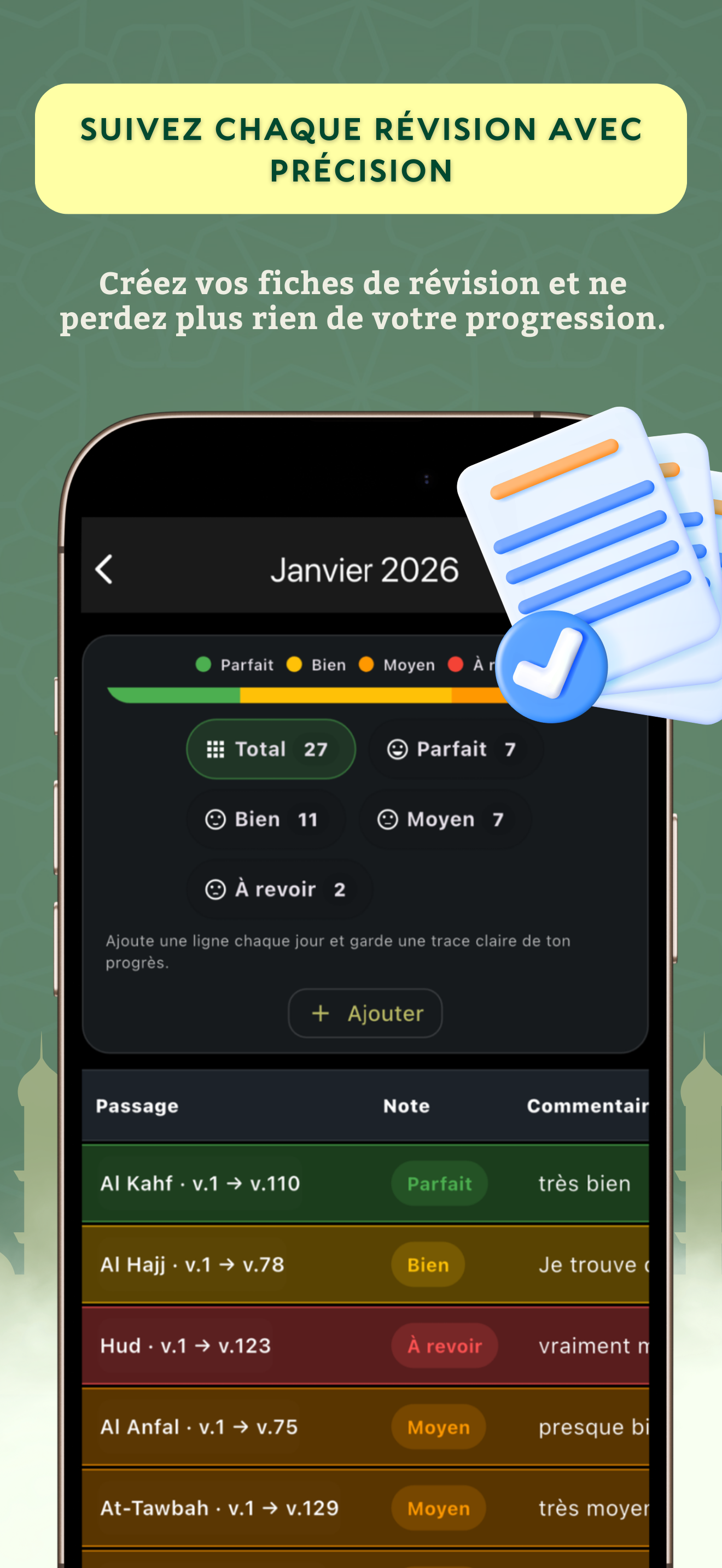 Réviser le Coran devient plus motivant avec un suivi clair qui aide l'élève à rester régulier, et permet au professeur d'accompagner chacun même avec un emploi du temps chargé, sans perdre la trace de sa progression.